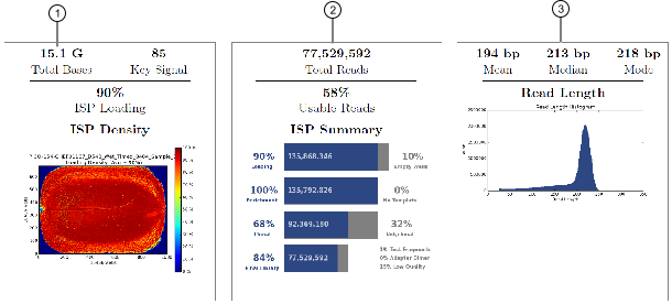 The throughput, total bases, and read length metrics are found at the top of the run report. This example is from the 200-base read run (500 flows) on an Ion 540™ Chip with a CEPH control library.