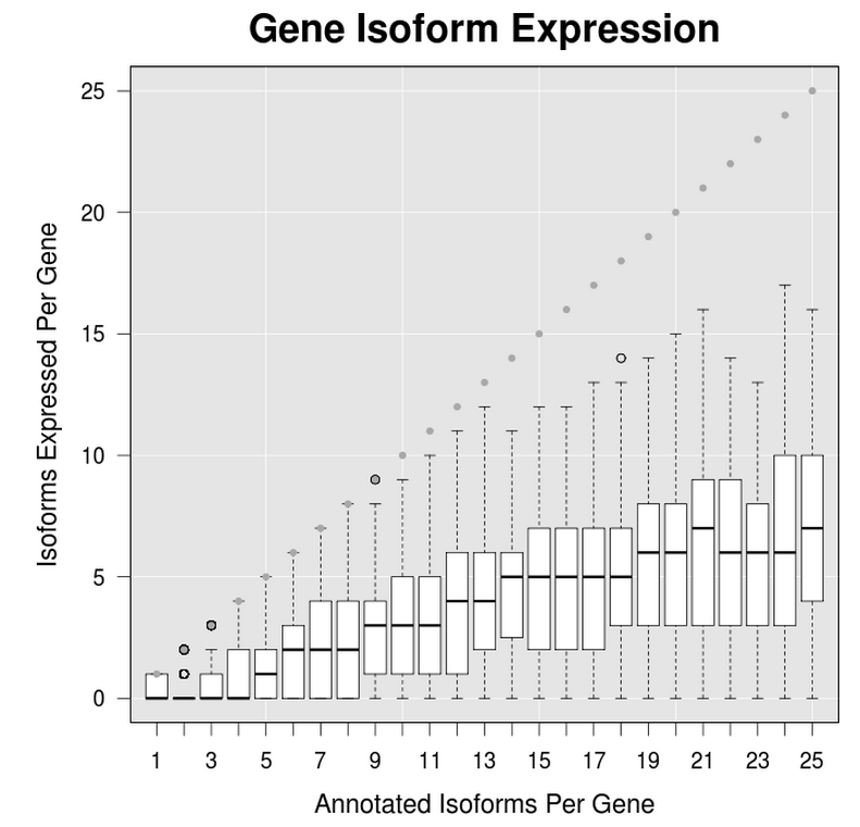 Isoform Expression— plots showing the variation of isoforms that are expressed at FPKM ≥ 0.3 for each set of genes that are grouped by the number of anticipated (annotated) . Whiskers points Q1-1.5xIQR to Q3+1.5xIQR. Only genes with 25 or less isoforms are represented in this plot. The data and a plot for all genes are available for download using the download reports links at the bottom of the screen.