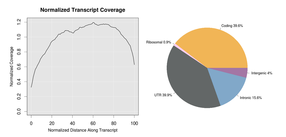 Transcript Coverage—A plot of normalized transcript coverage the frequency of base reads the length of individual transcripts they are aligned to in the 3' to 5' .