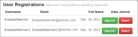 The User Registration section shows the pending requests for new user accounts:
