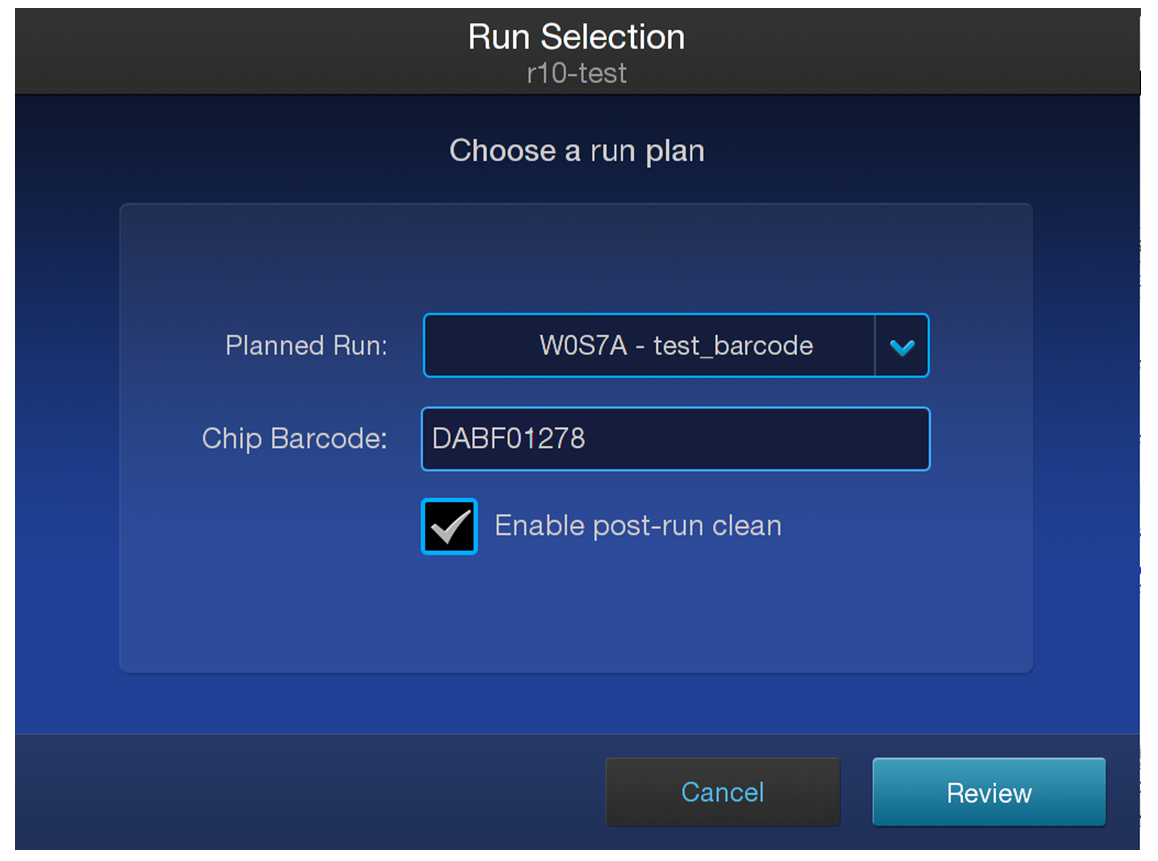 On the Ion GeneStudio™ S5 System and Ion S5™ System: Select your run from the Run Selection screen, then press Review. On the Select Run screen, ensure that the run selections are correct, then press Start run.