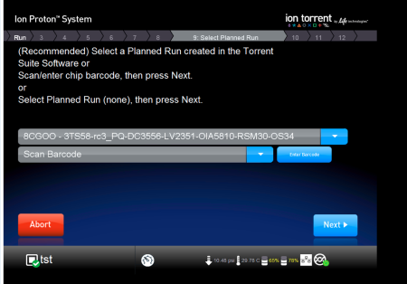 On the Ion Proton™ System: Press Run in the home screen, then follow the on-screen instructions. In step 9 of the workflow, select a Planned Run from the list, scan or enter the chip barcode, then press Next ►. Pending run information appears in the next screen. Follow the on-screen instructions to confirm the run information, load and calibrate the chip, and start the sequencing run.