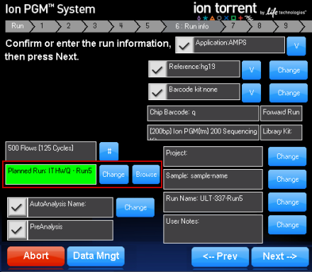 On the Ion PGM™ System: Press Run in the home screen, then follow the on-screen instructions. Pending run information appears in the Run info screen. If needed, press Browse to select a different Planned Run from the Planned Runs list. Press Next --> when you are ready to start your sequencing run.