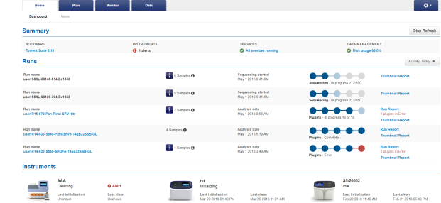 Use the Dashboard to see active and recent sequencing runs. The Dashboard provides an overview of activity on all of your sequencers. To view the Dashboard, click the Home tab, then click Dashboard.