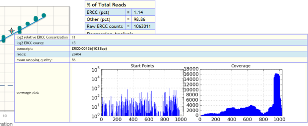 Using the plot—Hover your mouse-cursor over a point in the ERCC Dose Response plot to display a popup window that shows details regarding that transcript. Zoom in on the overlapping points on the plot to more easily distinguish the points.