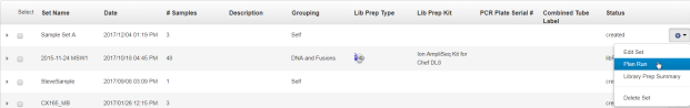 To plan a run using a single Sample Set, click in the row of the Sample Set.