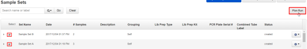 To plan a run using multiple Sample Sets, select the checkboxes next to the Sample Sets that you want to add to the Planned Run, then click Plan Run.