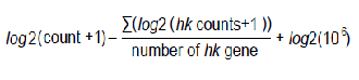 A table listing housekeeping-gene normalized, log2-transformed read counts for each barcoded samples along with gene annotations. Conceptually, these values are read count normalized by the average expression of housekeeping (hk) genes rather than by the total number of mapped reads as described above. The values are calculated as: