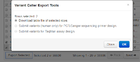 - In the Variant Calls by Allele table, select the checkbox in the row of each variant that you want to export, then click Export Selected.