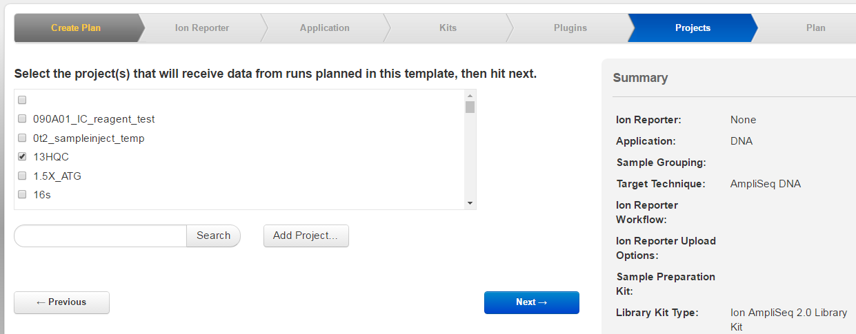 When you create a Planned Run, search for, then enter project names in the Projects step in the workflow bar: