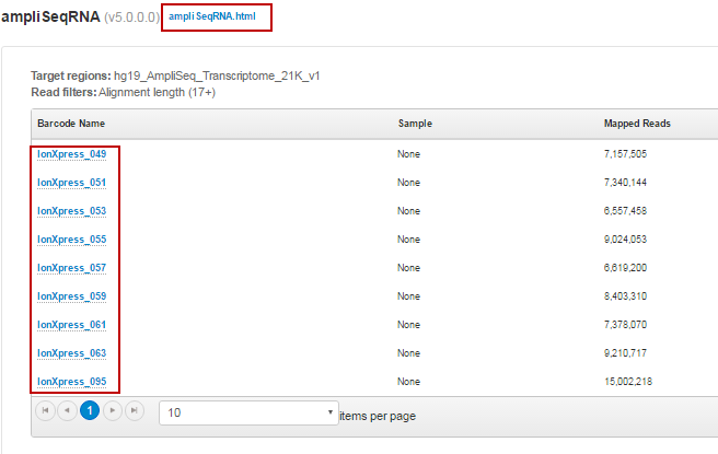 Click the ampliSeqRNA.html link to open the ampliSeqRNA Report – Barcode Summary for all barcodes.