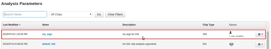Your new analysis parameter set is available in the Analysis Parameters table. The Source column lists the name of the user who created it.