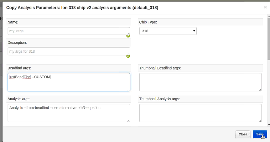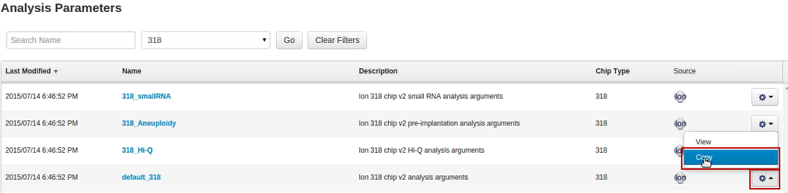 You can copy an existing analysis parameter set, and then customize the settings and save it as a new parameter set. We recommend this procedure if you need a unique analysis parameter set for a custom analysis that other users do not need to use in their runs. Copying an analysis parameter set ensures that the uploaded parameter set remains intact for other users.