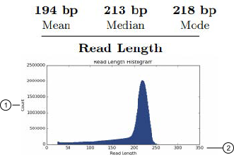 Read length value is the length of called reads measured in base pairs. The Read Length histogram presents all filtered and trimmed library reads reported in the output BAM file and the mean read length in base pairs. The shape of the histogram should closely resemble the library size distribution trace, without the adapter sequences.